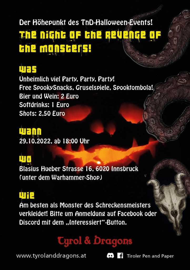 Es war wieder einmal so weit. Wir fanden uns zum RPG-Treff im Stadtteil-Treff Pradl ein, um gemeinsam unserem Lieblingshobby nachzugehen. Und diesmal standen die Spielrunden unter dem Motto Halloween!