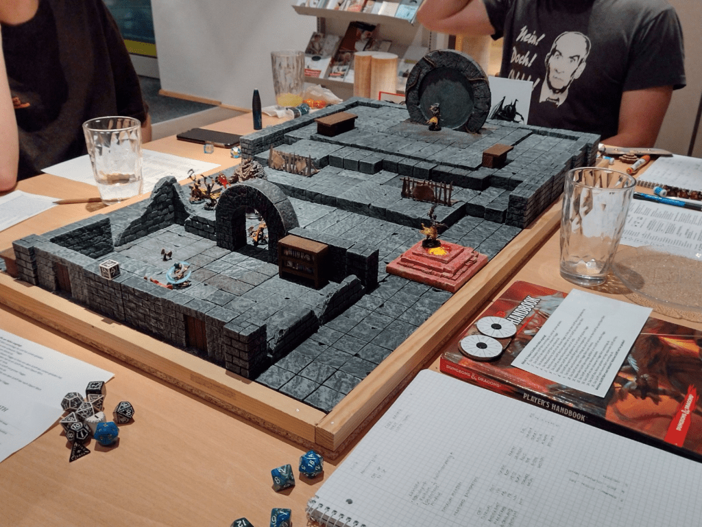 Am ersten Tisch leitete Thomas DnD für seine Spieler. Thomas leitete zum ersten Mal bei uns und er hatte kofferweise Material dabei. Denn er stellte seine Dungeons mit 3D-Modellen dar und hatte auch viele Miniaturen für die Spieler und die Gegner dabei. Durch mehrere Encounter, Rätsel und ein Dungeon arbeiteten sich die Spieler durch und waren am Ende erfolgreich. Drei der vier Spieler waren erfahrene DnD Spieler und Thomas und sie halfen dem Neuling in ihrer Runde mit den Regeln und Mechaniken. Alle waren sehr begeistert von der Runde.