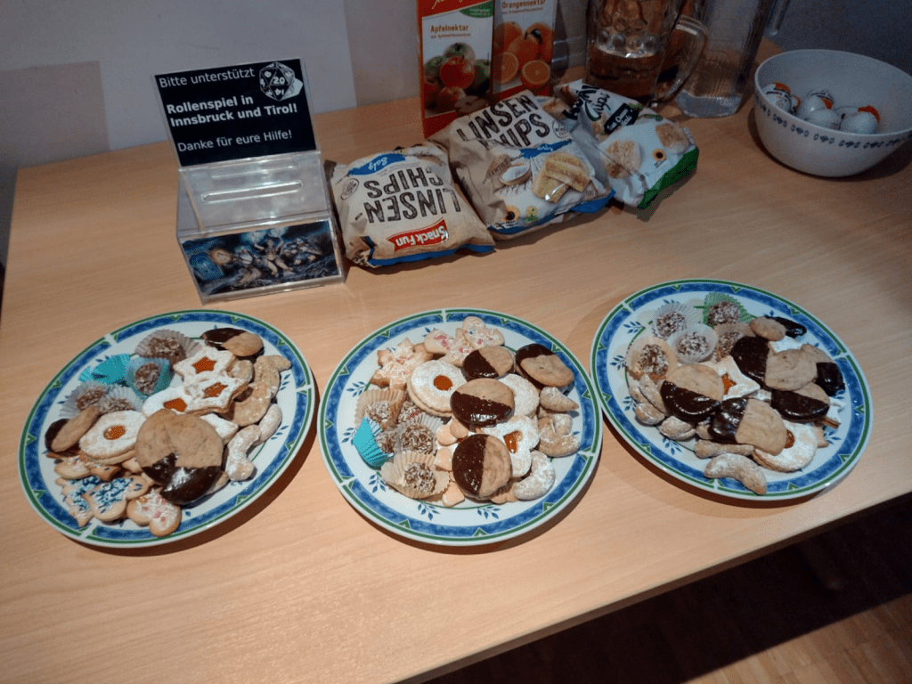 Auch in der stressigen Vorweihnachtszeit trafen sich einige Spieler:innen, um beim RPG-Treff letzten Sonntag (18. 12. 2022) spannende Abenteuer zu erleben. Wir wurden diesmal mit weihnachtlichen Keksen verköstigt, die Maddie und David gebacken und mitgebracht haben. Danke euch dafür, die waren superlecker 😊