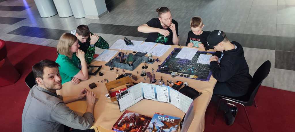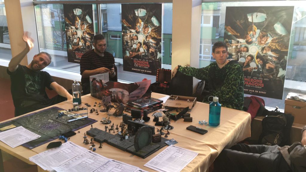 Dann trudelten nach und nach die anderen Spielleiter ein, bis wir zu fünft waren. Jeder hatte Würfel, Bücher und Miniaturen mitgenommen. Ein Bekannter, war sogar so freundlich uns seine handgemachten Miniaturen und sein Terrain zu leihen und vor Ort vorbeizubringen. Vielen Dank nochmal an Thomas. Damit sah unser Tisch dann recht cool aus und wir erwarteten die ersten Besucher. Am Nachmittag war es noch recht ruhig im Kino, bis schließlich zwei Kinder mit ihren Vätern zu unserem Tisch kamen und uns fragten, was das denn sei. Wir erklärten ihnen das Spielprinzip von Dungeons und Dragons und luden sie zu einer kleinen Spielrunde ein. Die beiden Kinder suchten sich beide einen Charakter aus und wir spielten los. Sie hatten das Spiel sehr schnell verstanden und es machte echt viel Spaß mit den beiden. Als die Demorunde fertig war, wollte einer der beiden sogar auch mal kurz die Spielleitung übernehmen und er hat sich dabei recht gut angestellt.