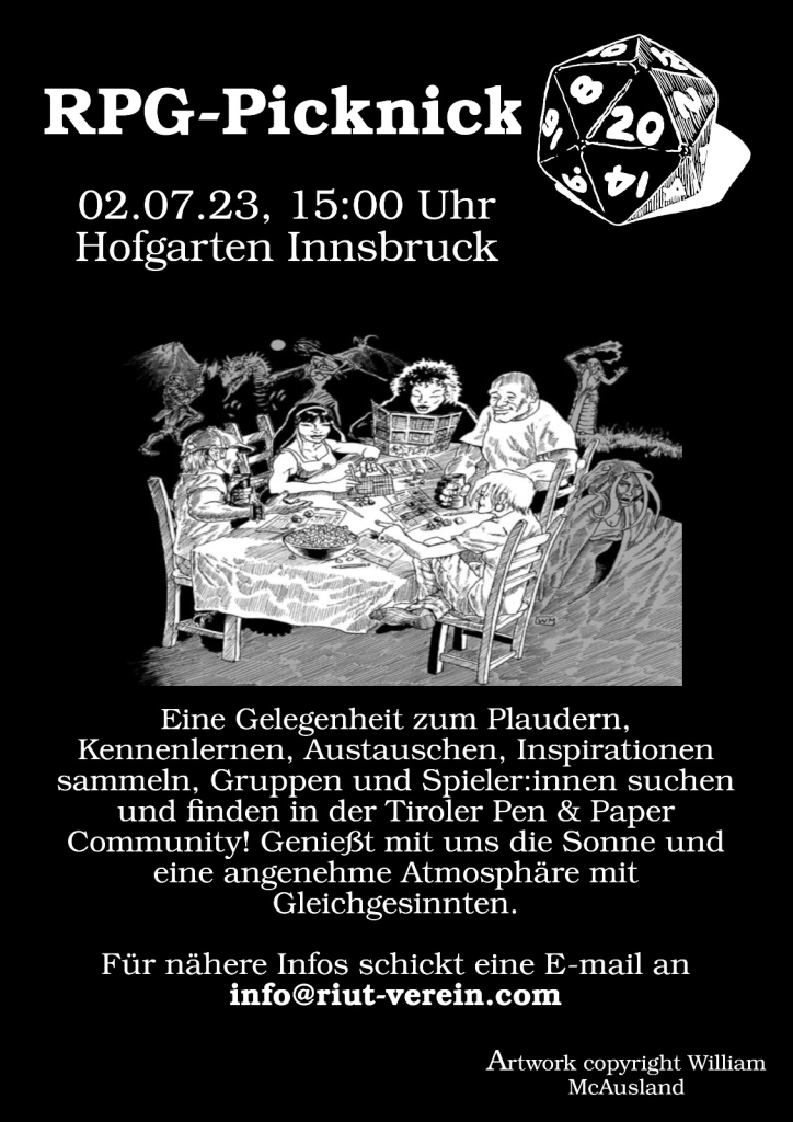 RPG-Treff-Special August: Am 27.8. findet ein RPG-Treff mit einem Motto statt: „Kriminal-/Detektivabenteuer“. Dieser Treff wird in der Pradlerei (Amraserstraße 29, 6020 Innsbruck) stattfinden. Dort haben wir etwas mehr Platz und werden vier oder fünf Spielrunden anbieten. Anmeldungen dafür wie immer per mail an info@riut-verein.com