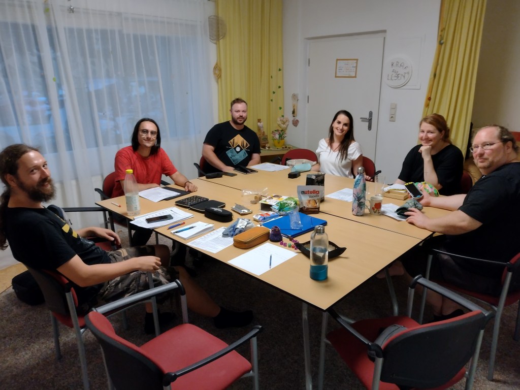 Die Leitung des Workshops übernahmen ich (David) und Norbert. Die Teilnehmer waren 5 Vereinsmitglieder, die bisher keine oder nur wenig Spielleitungs-Erfahrung hatten und deren Potenzial wir fördern wollten. Wir trafen uns um 15 Uhr in der Speckbacherstraße in den Räumlichkeiten des Vereins Kraft für Leben, welche wir für die Veranstaltung verwenden durften. Die Räumlichkeiten sind sehr ordentlich und schön dekoriert. Wir haben uns gleich sehr wohlgefühlt, besonders da es drinnen kühl war und uns bei der Hitze auch noch ein kleiner Garten mit Pavillon zur Verfügung stand.
