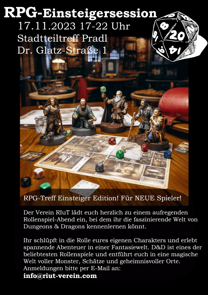 Im Sommer hatte Martin die Idee einen RPG-Treff nur für Neulinge zu machen. Diese Idee passt natürlich perfekt in unser Vereinskonzept und es gab ja auch schon Einsteiger-Sessions, doch die haben wir bisher im privaten Rahmen gemacht. Jetzt wollten wir das etwas größer aufziehen und fixierten die Räumlichkeiten des Stadtteiltreff Pradl. Dann kam ein Flyer dazu und schon bald kamen die ersten Anmeldungen dafür.
