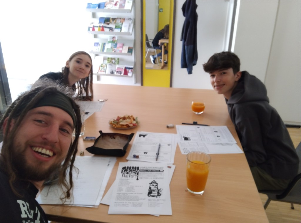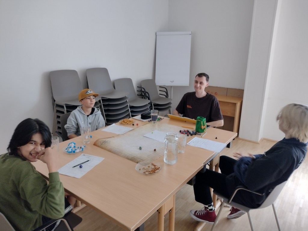 Wir trafen uns im Stadtteil-Treff Pradl um 15 Uhr. Leider mussten ein paar Teilnehmer*innen kurzfristig absagen, aber trotzdem hatten wir genug Leute für 2 Spielrunden. Als Erstes gab es wieder die altbewährte Vorstellungsrunde. Dabei stellte ich den Teilnehmenden die Frage, wie sie auf das Rollenspiel-Hobby aufmerksam geworden sind und welche fiktiven Charaktere sie besonders interessant finden.