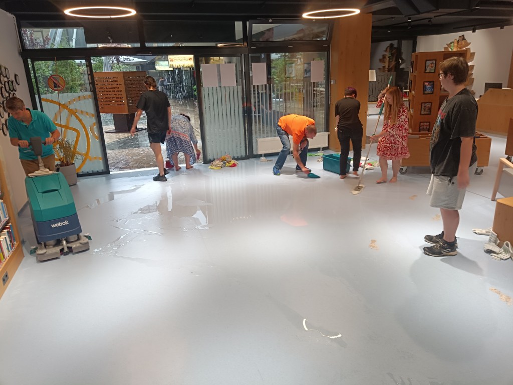 Mitten im Spiel wurden wir jedoch von einem extremen Gewitter überrascht, das uns zwang, eine kurze Pause einzulegen. Die echte Welt holte uns zurück und gemeinsam mit den Leuten der Bücherei sicherten wir die Bücher und Möbel, während wir die Wassermassen, die durch die Tür eindrangen, in Schach hielten. Nach einer Stunde intensiver Wasserbekämpfung konnten wir glücklicherweise das Spiel fortsetzen.